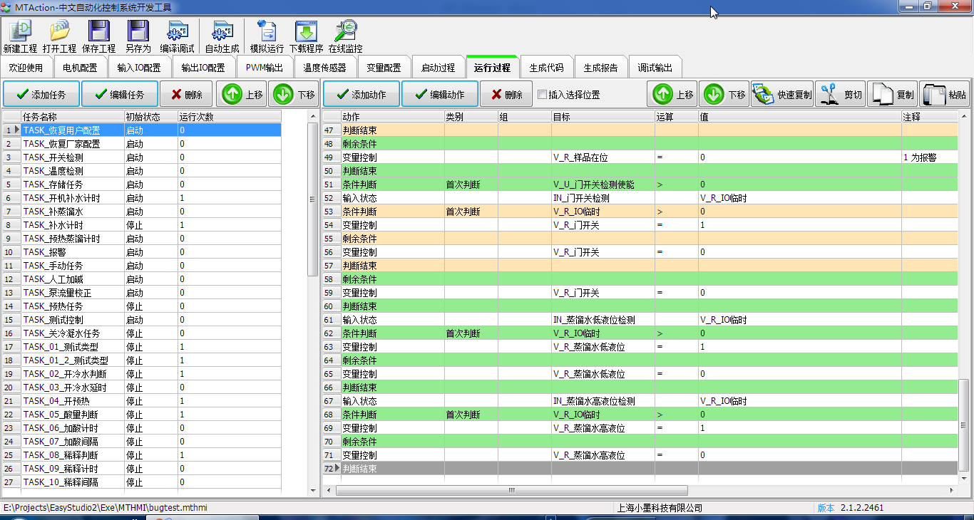 - PLC(脱机自主运行)功能是指可以通过我司提供的MTAction软件,进行中文表格式或者脚本式编城,然后下载到板卡里面独立脱离电脑运行,同时可以和HMI人机界面或者电脑通过标准协议或者Modbus-RTU协议交互